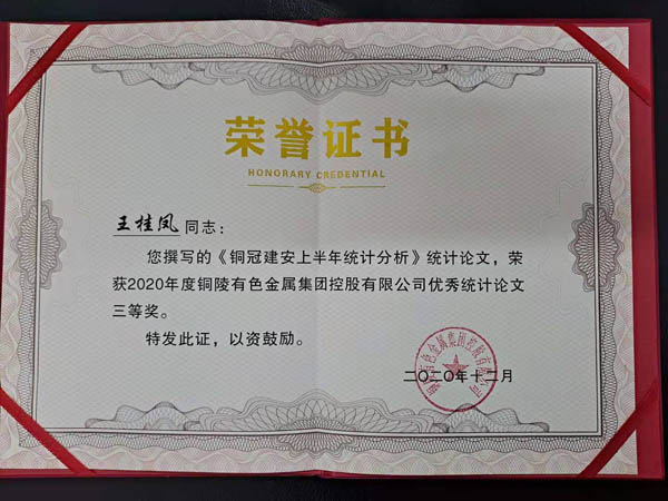 12月29日,在集團(tuán)公司統(tǒng)計(jì)工作會(huì)議上,公司獲“2020年度統(tǒng)計(jì)工作先進(jìn)單位”榮譽(yù)稱號(hào),公司《銅冠建安上半年統(tǒng)計(jì)分析》論文榮獲集團(tuán)公司優(yōu)秀統(tǒng)計(jì)論文三等獎(jiǎng)。